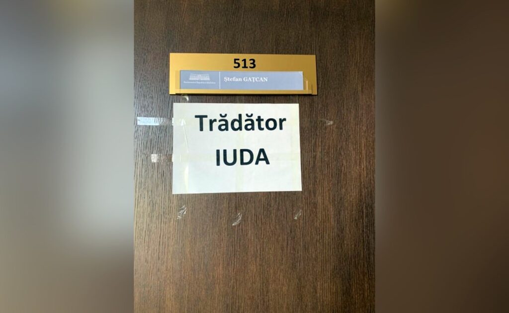 Pe ușa biroului din Parlament al deputatului Ștefan Gațcan, care a părăsit astăzi fracțiunea Partidului Socialiștilor, au apărut noi „inscripții”. Acesta este numit trădător, fiind blamat pentru decizia de a părăsi partidul sub umbrela căruia a ajuns deputat. Ultima dată îi scriau și îi strigau lui Iurie Roșca.